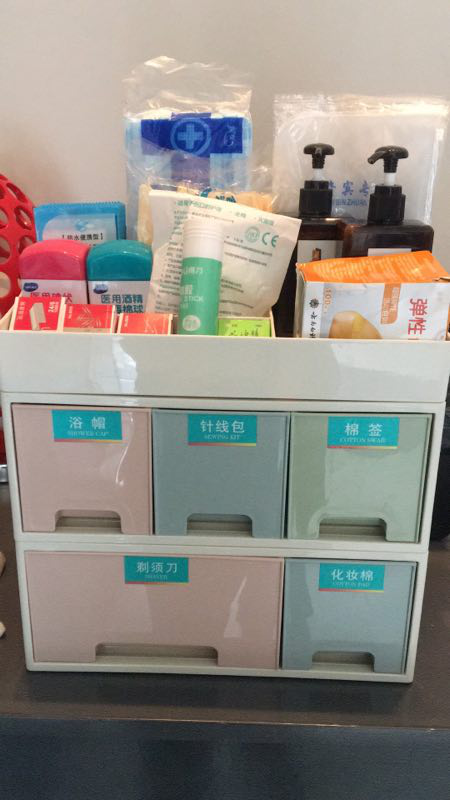 男女士用品——有化妆棉、水、乳、护手霜、剃须刀等,有的顾客可能出门忘记带剃须刀、化妆棉等生活必需品,或者一些女顾客需要水、乳、护手霜等,酒店均可提供。