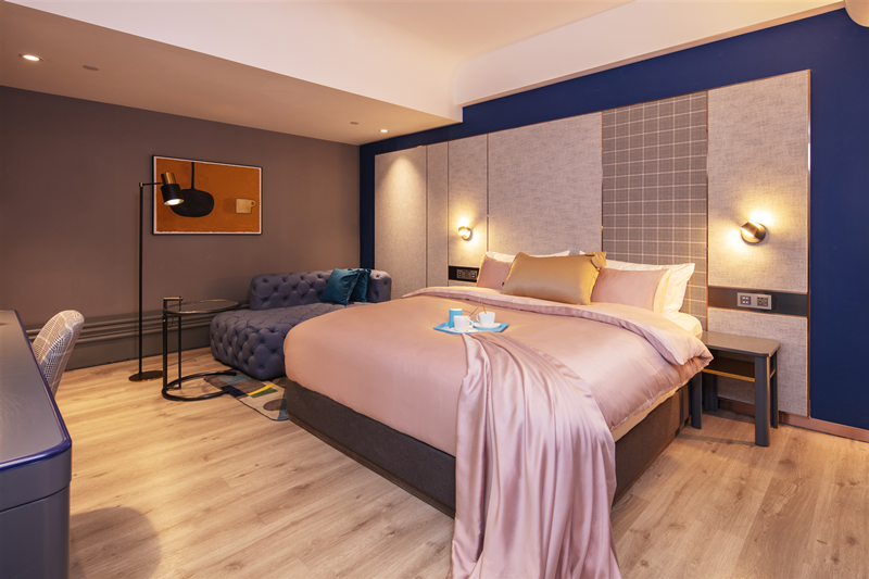 “先锋”一词来自“先锋艺术”,一般用来泛指“前卫”与“时尚”。时尚是社会的潮头,也是在85、90后新中产者追求的目标。基于此,“华纳国际”通过前卫的设计理念把酒店建成“酒店+时尚”的时空。在客房造型上,采用现代设计元素,那饱和度高的挂画、流畅贯通的房间线条、蓝灰白的墙体立面,营造出一个舒适、安全的立体空间,给人一种优雅、含蓄、内敛的美学体验;在酒店走廊上,天然大理石纹理与深色地毯相互映衬,摆放精品艺术装置的廊壁耳目一新,构成一条艺术长廊,让人行走舒适,视觉感受丰富,心灵为之一震。